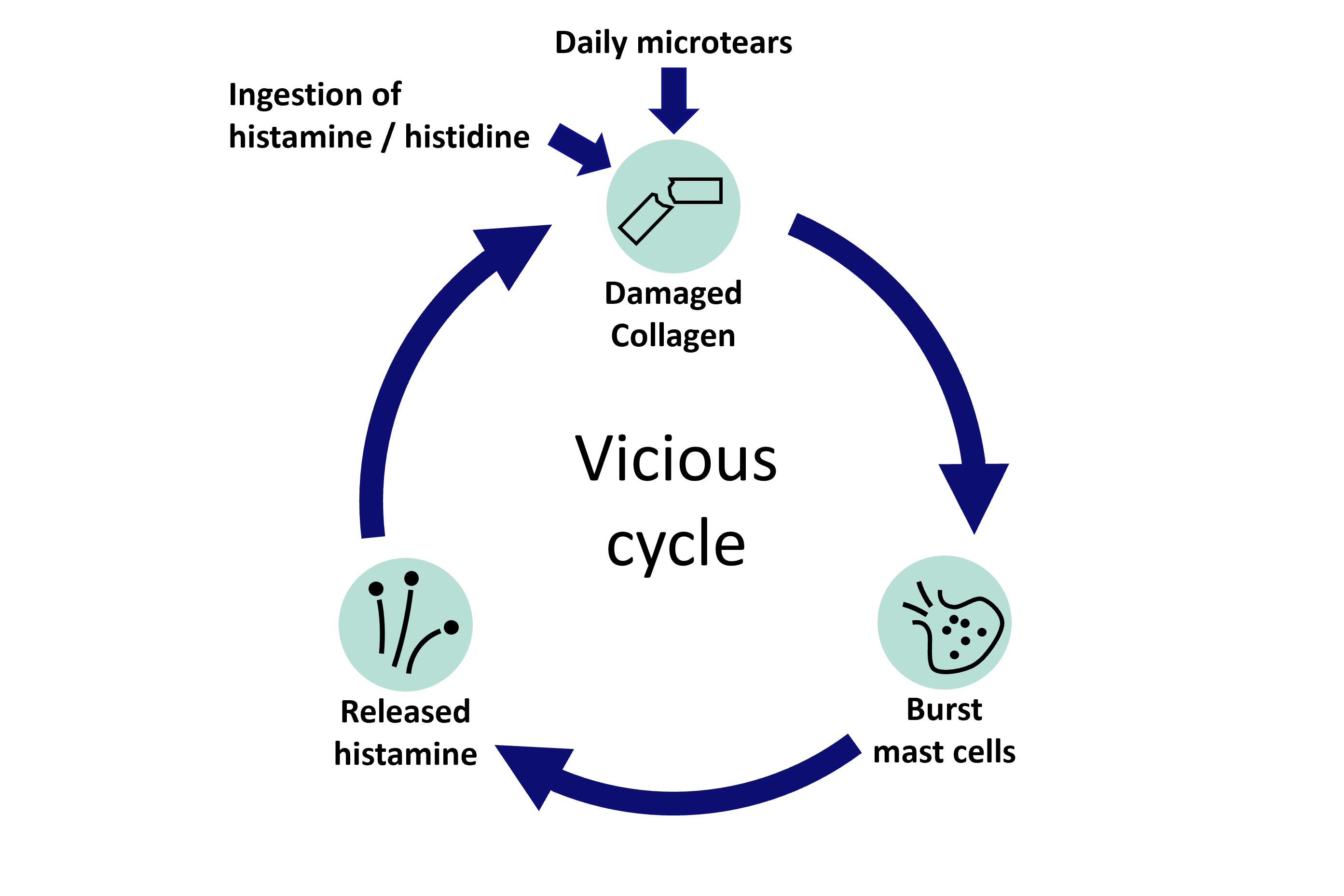 8) A vicious cycle, as we now have further weakening and damage to collagen which is then more prone to new microtears...causing nearby mast cells to release more histamine.